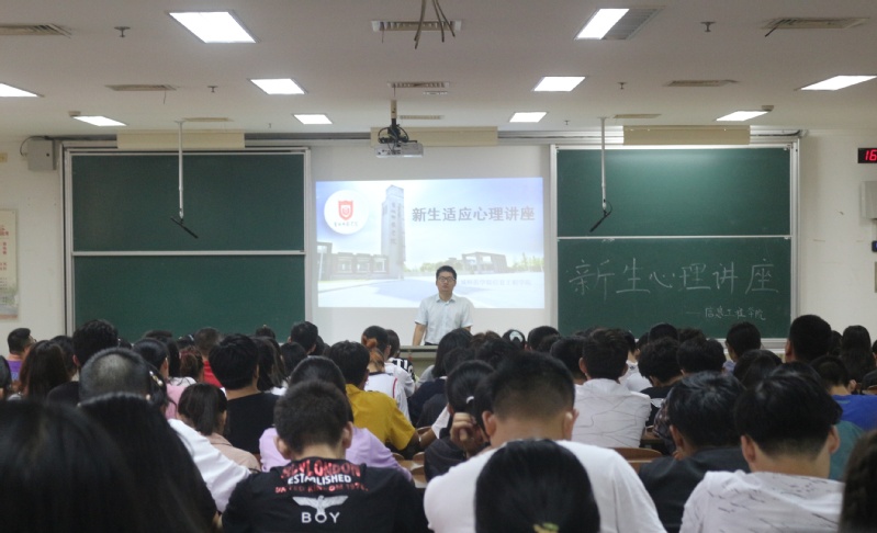 操场活动结束后,心理辅导员薛殿春在主楼B101作了新生适应心理专题讲座。