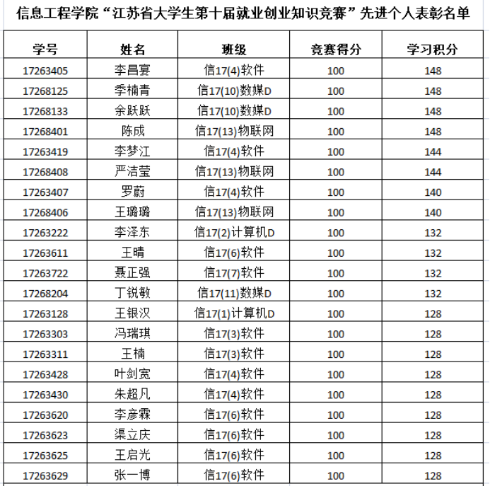 加强考评,调动学生参赛积极性。根据竞赛得分和每日学习积分排名,评选出软件174班李昌宴等21名同学获得“就创业知识竞赛先进个人”称号;根据班级满分率和平均分排名,评选出软件174班、软件177班、计算机171班获得 “就创业知识竞赛优秀组织奖”。评比与表彰活动激发了全体学生的竞赛热情,2017级学生371名同学全部参加了知识竞赛,共有103位同学竞赛得分为满分,33名同学学习积分超过120分;学院参赛率100%,平均分83.8分,排名位居学校前列。