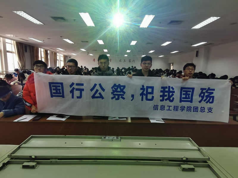 活动过程中,同学们共同观看了关于南京大屠杀的纪录视频短片。纪录片控诉了83年前日军惨无人道的暴行,呈现了中国人民遭受的非人的折磨与屈辱。视频观看完毕后,全体同学起立默哀,缅怀在南京大屠杀中遇难的30万同胞,祈愿世界和平。随后,现场同学依次进行演讲及历史知识竞赛答题,并开展国家公祭日签名活动。现场的横幅上写着“国行公祭,祀我国殇”“勿忘历史,复兴中华,逐浪潮头,做新时代新青年”,同学们踊跃参与,纷纷在横幅上签下自己的姓名,表达爱国之情。