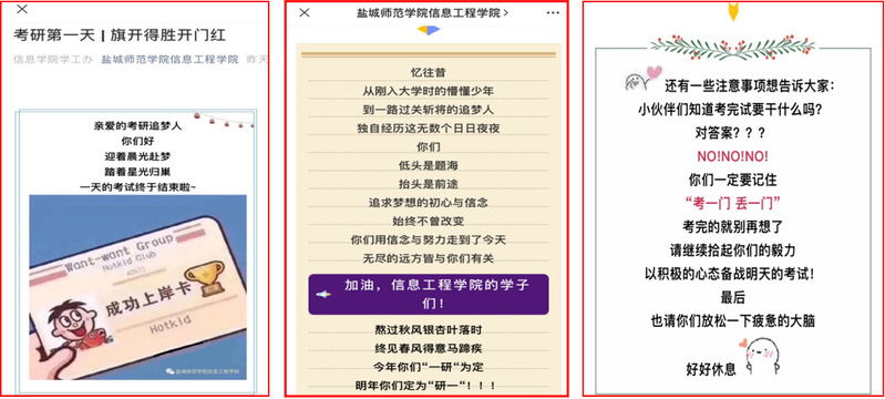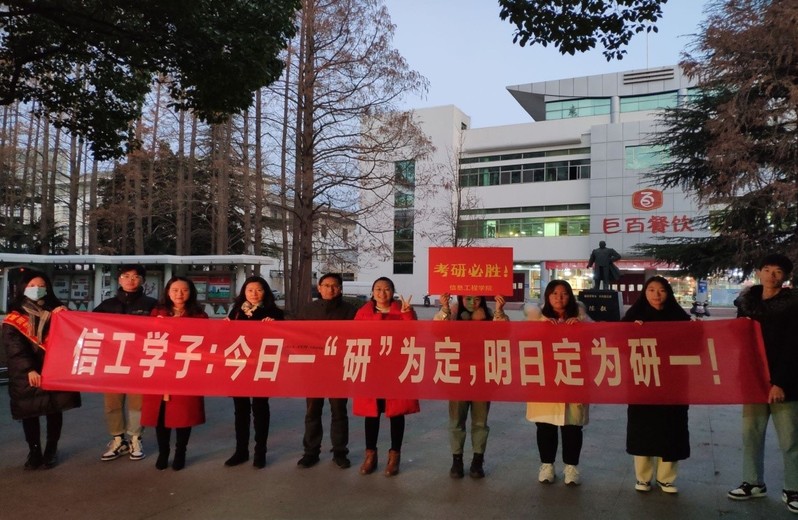 我院精心组织考前准备工作,开展系列考研慰问活动:帮助心理辅导与疏导,发放防疫口罩、考研文具和暖心食品;“信工学子:今日一‘研’为定,明日定为研一”“妙笔生花,研榜提名”,学弟学妹们集体送考研祝福。