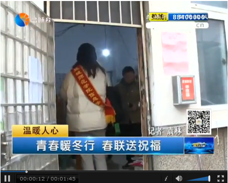1月25日,盐城广电全媒体新闻中心报道我院“青春暖冬行,春联送祝福”志愿服务活动。此次活动增加了我院学生身上的社会责任感,引导广大青年学生积极践行社会主义核心价值观,传递社会正能量。
