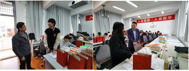 随后,学院领导为考研学子送上精心准备的考研礼包:红色的礼物袋贴上了每一名同学的姓名及鼓励话语,精心挑选的2B铅笔、橡皮、中性笔等解决了考研必需,寓意考研“橙”功上岸的橙子和一“啡”冲天的咖啡增强了同学们的考试信心,传递了学院对同学们的美好祝愿。