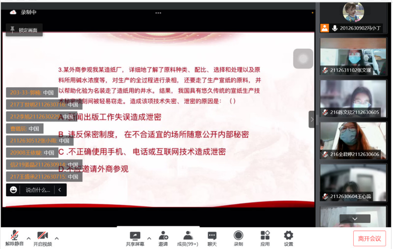 活动共分为两部分:“云”上国家安全教育讲座、“国家安全教育知多少”线上答题。强宣传学习,筑牢思想防线。在“云”讲座中,学生讲解员从“树立国家安全意识,保守国家秘密法”的角度出发,引导大学生汇聚共识,立足法治,厚植国家安全情怀,增强国家安全法制理念。