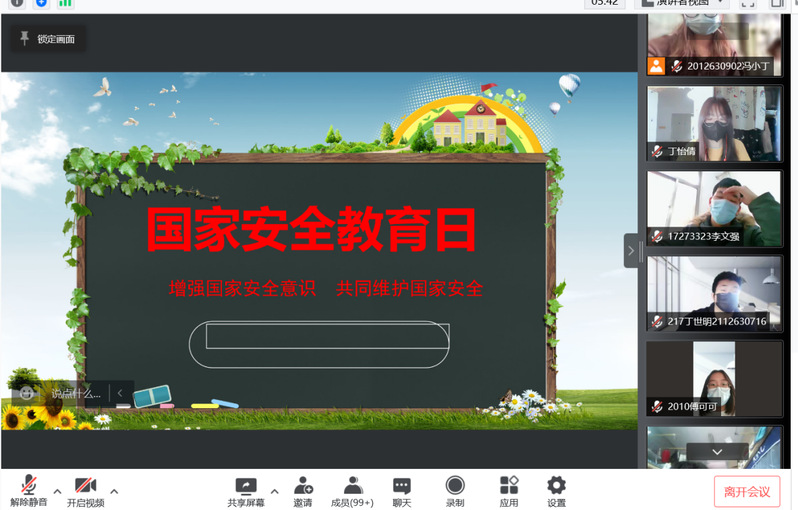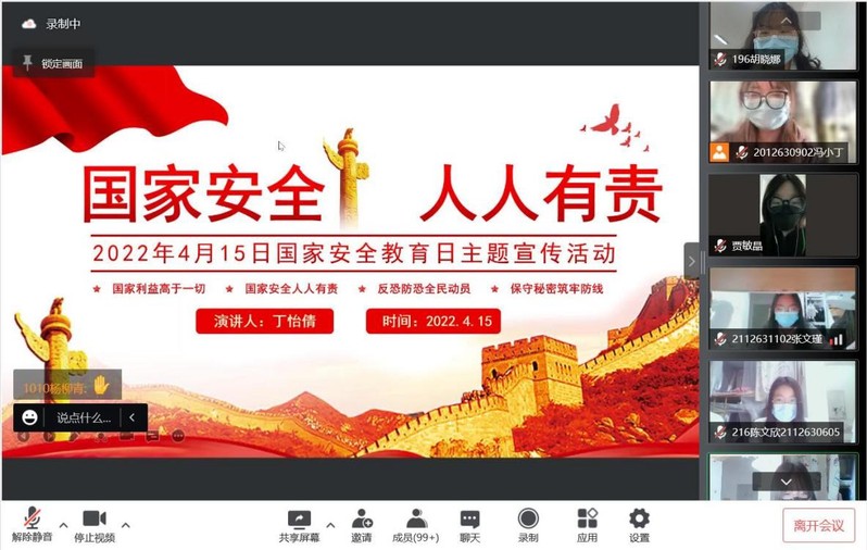 今年的4月15日是第七个全民国家安全教育日,正值迎接党的二十大召开之际,为全面贯彻落实总体国家安全观,进一步推动国家安全意识深入人心、落地生根,4月15日,我院以“献礼党的二十大,安全同行你我他”为主题,组织开展线上国家安全日活动。学院大一、大二学生积极参与。