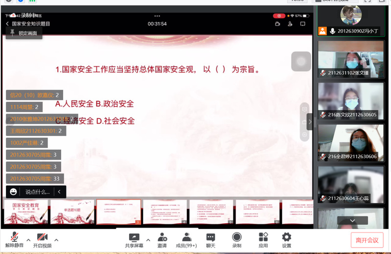 线上答题部分,围绕国家安全法、网络安全法、生物安全法等设置竞答题目,参与者统一在聊天区回复主持人说出的“口令”,第一位回复的同学即可获得答题机会。一时间大家争先恐后,积极做答,展现出了当代大学生的热情与朝气。该环节融竞争性、互动性、趣味性、知识性于一体,从日常息息相关的常识入手,让同学们进一步提高对国家安全、法律法规等方面的认识,减少了安全知识的盲区、误区。