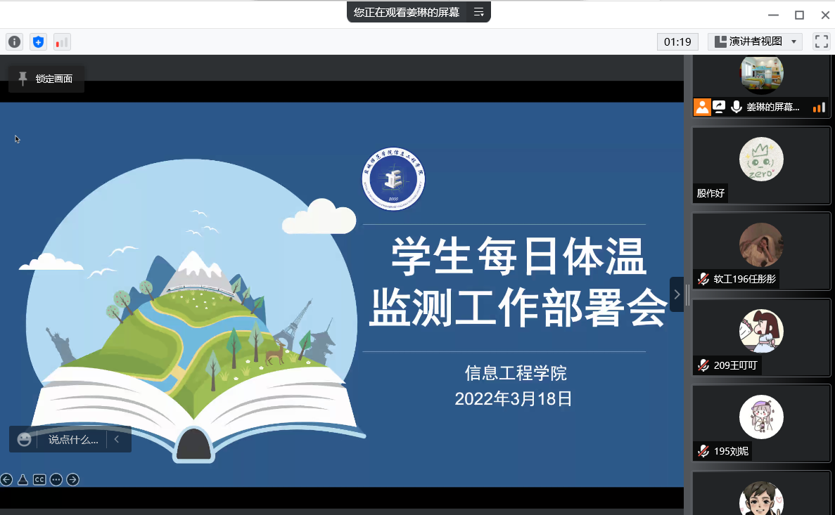 学院在3月18日召开学生每日体温监测工作部署会,由班级副班长担任测温员,会议明确测温员工作职责,建立每日班级体温汇报制度并要求测温员发现体温异常者立即上报学院;针对前期发放的额温枪损坏或丢失等情况,辅导员紧急购置额温枪,确保每班额温枪不少于两把;测温员每日定时开展测温工作,并将相关情况在体温监测群中汇报,形成健康监测闭环管理。