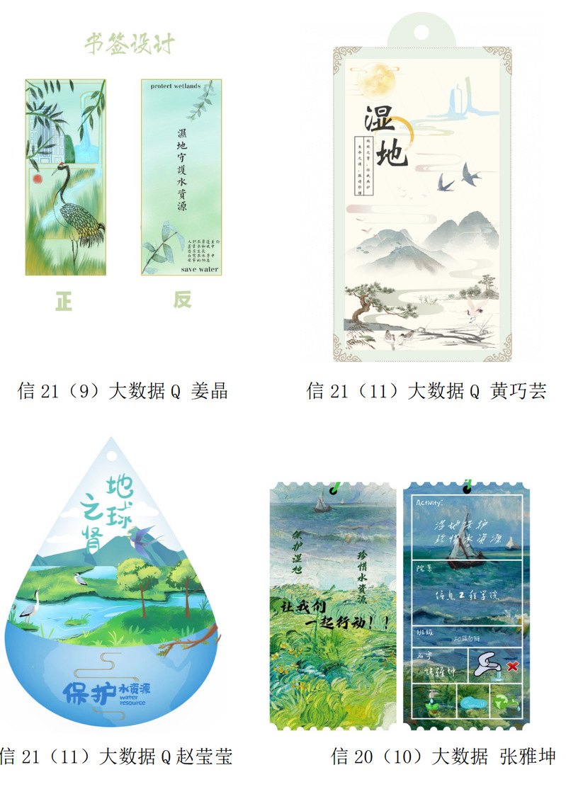 活动以主题海报、电子创意书签两种形式,将“湿地保护水资源”的理念融入专业创作中,引导青年大学生能够胸怀天下,尊重自然,保护自然,推动湿地保护,为世界担当,为地球担责。活动中,同学们展开丰富的想象力与创造力,以湿地自然风光为主体,结合宣传标语,无声地展现出湿地作为世界自然遗产的魅力,有力地传达保护湿地环境、积极建设生态文明的信念。活动共计收到作品81份,作品紧扣主题、设计精巧,起笔于湿地大美的生态风景,落笔于湿地守护的重要意义。最终,活动评出特等奖作品6件,优胜奖作品9件。活动参与者,大数据2110班王慧辰表示:“参加这次活动我很开心,在制作海报的过程中,我深刻了解到湿地作为‘地球之肾’在调节大气、净化水质、调节径流、保护生物多样性等方面的重要作用,山水有礼,让我们从小事做起,一起做湿地文明的‘守护者’,为建设湿地贡献自己的力量。”