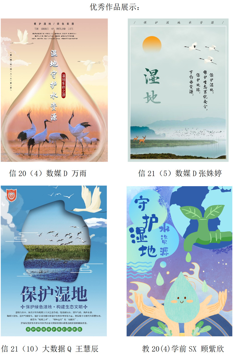 为践行习近平生态文明思想,鼓励青年学生积极投身于家乡生态文明建设和湿地环境保护。5月中旬,我院团委举办“湿地守护水资源”主题海报设计活动。活动由数字媒体协会承办。我院共计110名学生参加。