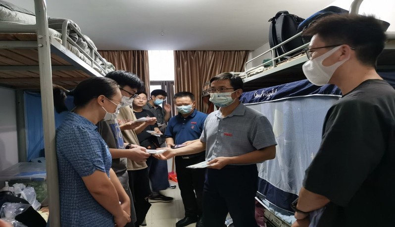 “你来自哪里?”、“到盐城后适应这里的天气吗?”、“食堂吃得习惯吗?”学院领导向学生表达了亲切问候,在轻松的交谈中了解新生的校园适应、家乡背景、学习准备等情况。同时领导老师们殷切勉励新生,要多与学院老师交流,建立有效沟通渠道;遇到困难要及时向老师寻求帮助;此外学好专业知识之余还要提前做好规划,努力提升自我。走访中,学院领导向新生发放了学院设计的特色口罩,提醒新生遵守学校各项疫情防控规定,传递出师生团结一心、众志成城战胜疫情的信心。