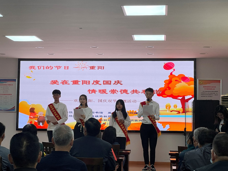 国庆、重阳“双节”来临,为丰富社区老人节日生活,增强爱国情怀,弘扬中华传统文化,10月4日,我校我院青年志愿者奔赴新都街道娱乐社区开展“爱在重阳度国庆,情暖崇德共和谐”——欢度重阳、国庆双节主题活动,送文化进社区。此次活动由盐城市图书馆、我院、新都街道娱乐社区在娱乐社区党群服务中心联合举办,学院十余名志愿者参加。